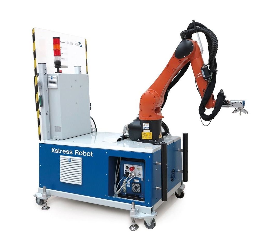 一个标准的XStress3000应力分析仪和一个带有手臂的机器人测角仪。新的XTronic软件使测角仪在机器人手臂的自由移动过程中灵活测量,测量范围可扩大到机器人四周,甚至是曲面的应力测量也可以做到不用移动被测样品。应力检测中较难的定高、定位、测角仪的运动等,在机器人系统中都得到很好的解决。机器人系统具有智能化仿形功能,通过图形记忆,可自动进行应力分布测试,特别是表面不规则的零部件,更能体现机器人优越性。